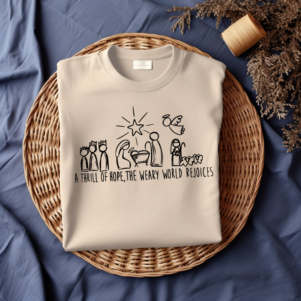 Celebrate the true meaning of Christmas with our A Thrill of Hope, The Weary World Rejoices Shirt. Featuring a beautiful manger scene and elegant lettering, this design captures the heart of the season—a reminder of peace, joy, and faith. Perfect for those who want to share the message of Christmas in a meaningful way.