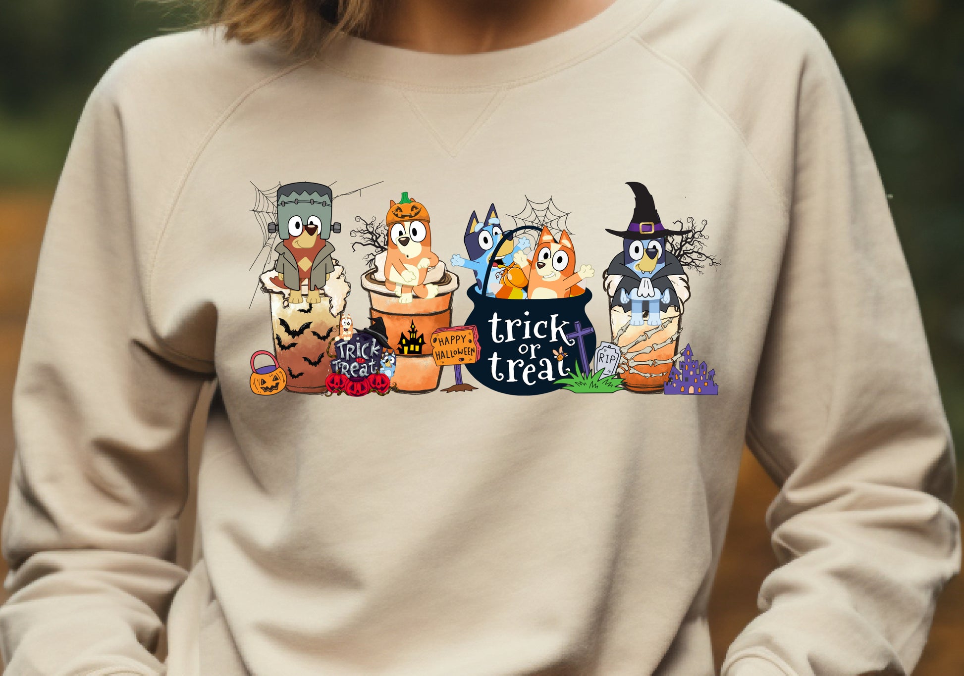 🐶👻 Trick-or-treat with everyone’s favorite pup family! Our Bluey Family Halloween design features Bluey, Bingo, Bandit, and Chilli all dressed up in their festive costumes—ready for candy, fun, and spooky adventures. This adorable design is perfect for kids, families, and anyone who loves Bluey!