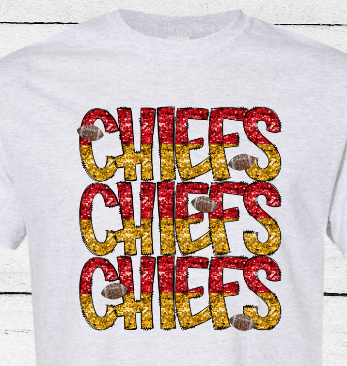 High-quality faux glitter triple Chiefs logo print