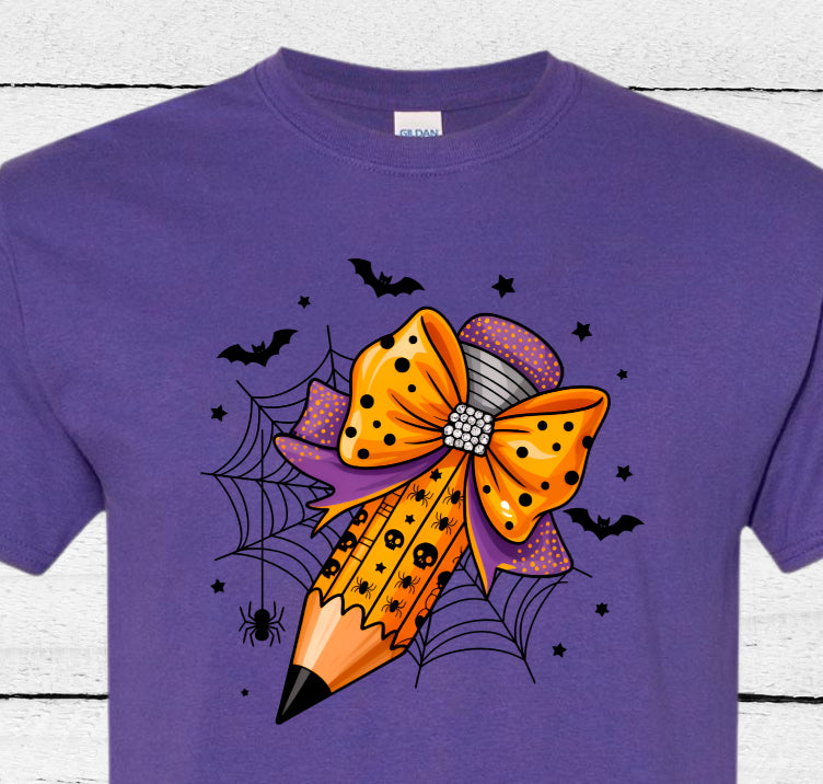 βοΈππ» Add a touch of spooky charm to your classroom style with our Pencil & Bow Teacher Halloween design! Featuring a festive pencil topped with a cute bow and Halloween flair, this design is perfect for teachers who love celebrating the season while keeping it fun and school-friendly.