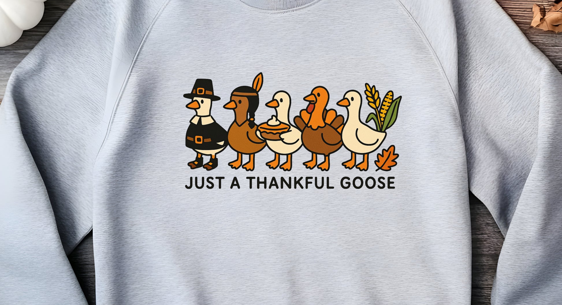Celebrate the season of gratitude with our Just A Thankful Goose design! Featuring a charming, cute goose ready for fall, this shirt is perfect for showing your Thanksgiving spirit with a touch of humor and whimsy.