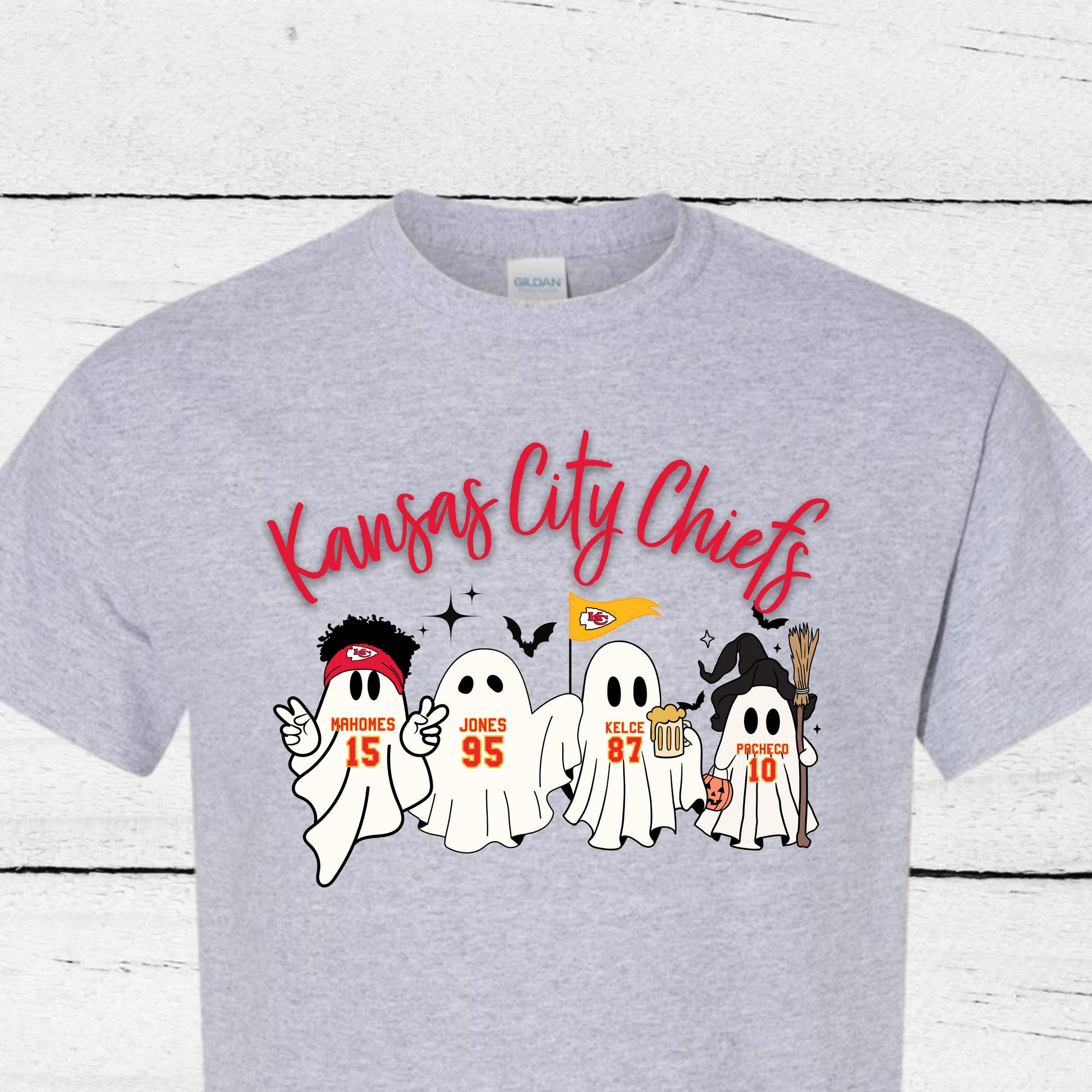 Celebrate spooky season and football season at the same time with our exclusive Kansas City Chiefs Halloween Ghosts design! Featuring Chiefs superstars Patrick Mahomes, Travis Kelce, Chris Jones, and Isiah Pacheco reimagined as fun, spirited ghosts, this shirt is a must-have for fans who love Halloween and KC football.