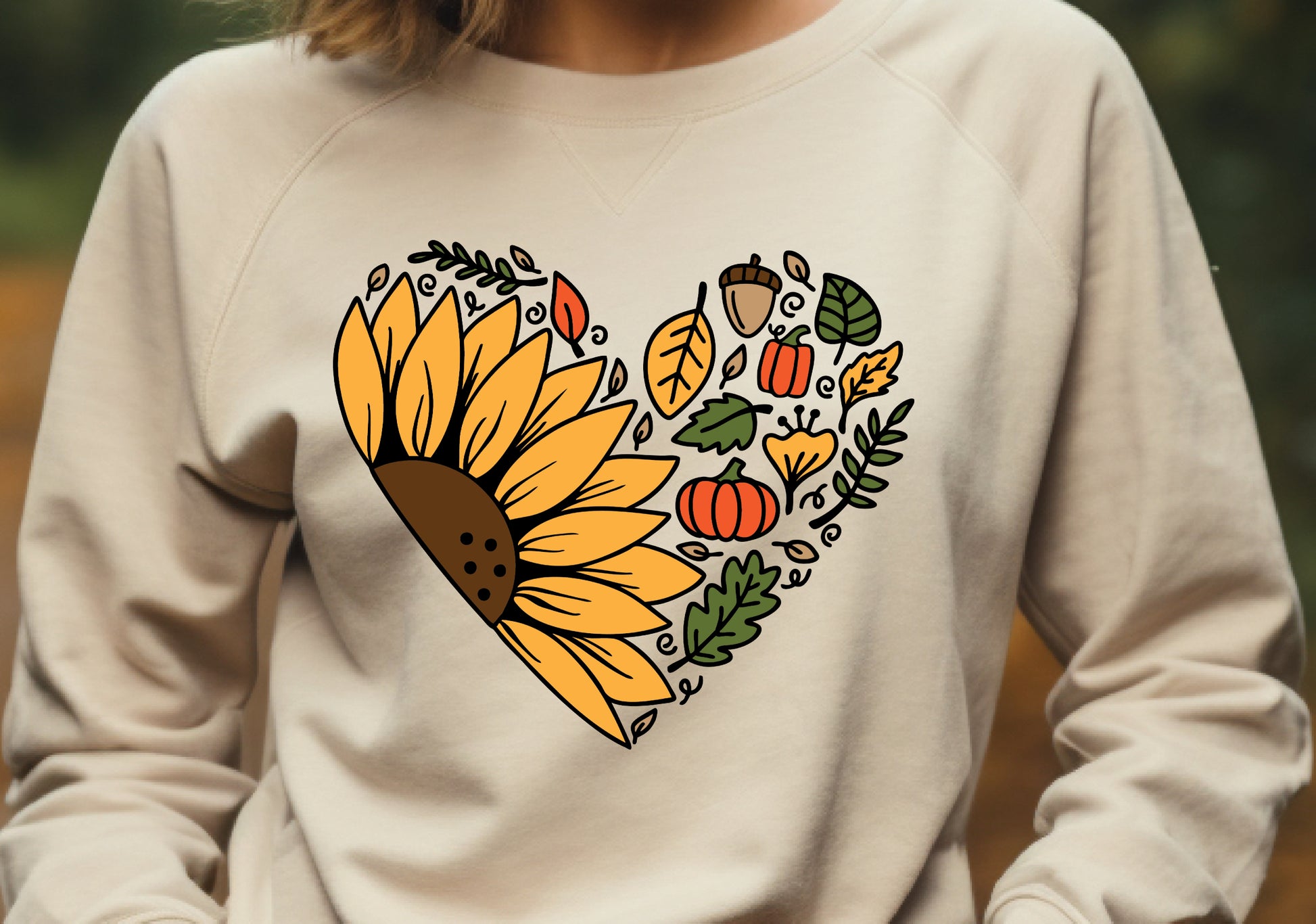 The sunflower heart design captures the beauty of fallâbright, happy, and full of warmth. Perfect for everyday wear, fall festivals, or Thanksgiving gatherings, itâs a seasonal favorite that feels just as good as it looks.